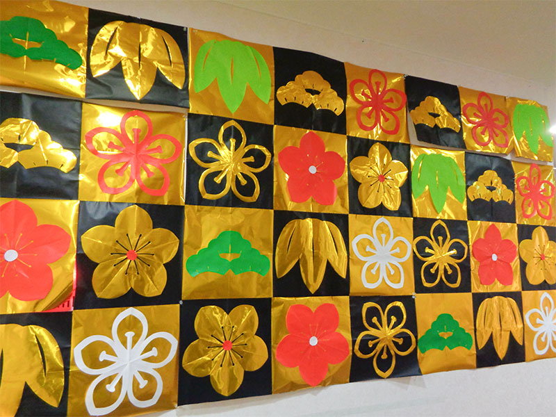 今年は紅白のだるまと壁一面に折り紙で作った松竹梅の壁画が飾られています。きらびやかでとても綺麗ですね。利用者様と職員の合作は見事です。