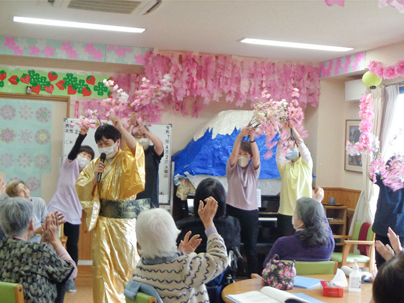毎年恒例のお花見会を4月2日水曜日に行いました。当日はあいにくの雨で、室内でお花見弁当を食べました。
